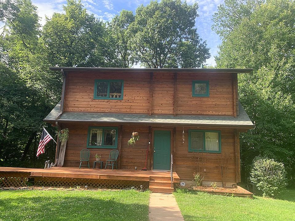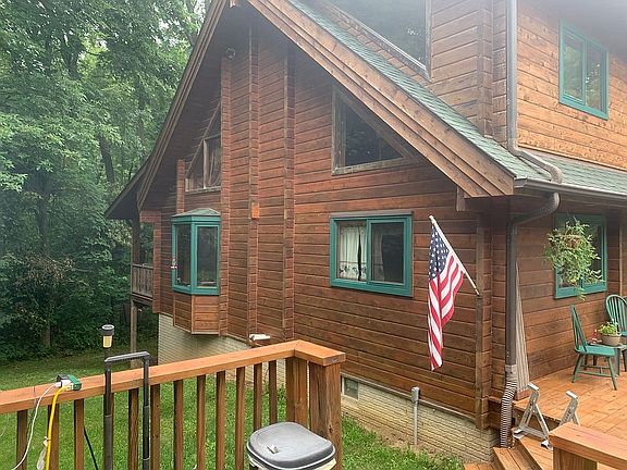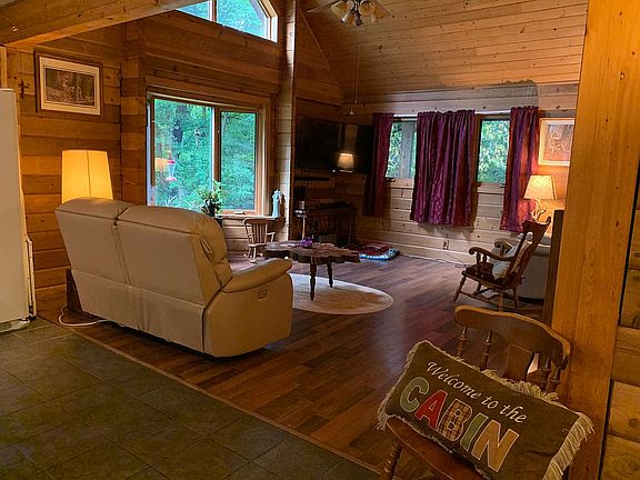 very cute log cabin in a private setting surrounded by trees. Lots of flat area that could be cleaned out. Creek on the property. Lots of wild animals. The cabin has an open floor plan with a loft above. The basement is finished and a walk out. The above ground pool is an added bonus. The extra shed stores all the lawn equipment and pool equipment. updated septic 2008, individual well.