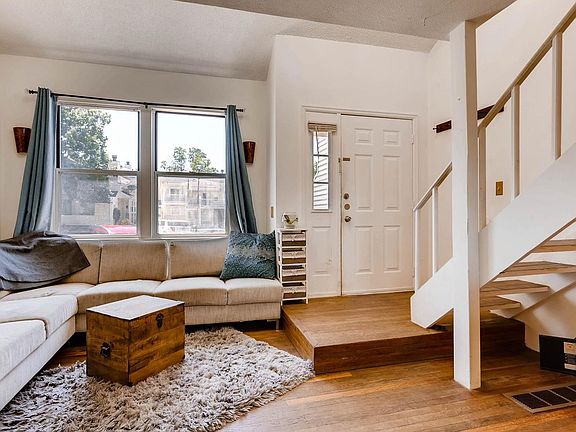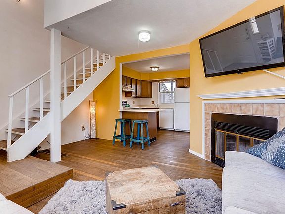 You won't want to miss this charming townhouse with soaring vaulted ceilings, skylights, a private back patio and mountain views!! The beautiful original hardwood floors run throughout the entire unit. The master bedroom is a loft style with with a partially updated bathroom and a deck with stunning mountain views off it. The private back patio backs up to a large open green space that is perfect to let dogs run around on and that backs up to a huge park. This unit has a parking spot directly in front #9. All the furniture in this unit is up for sale and negotiable!!