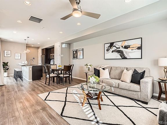 As you step inside, you'll be wowed immediately!!! This 2020 home offers a spacious open floor plan designed with convenience to fit your lifestyle! Abundant natural light beams throughout the inviting interior and is accented by tall ceilings, neutral paint, and modern lighting. Easily entertain from the spacious open-concept main floor with a sliding glass door off the kitchen that connects seamlessly to the covered patio which is the perfect place to enjoy the Colorado weather all year long. The kitchen features granite countertops, designer backsplash, stainless finish appliances, and a functional island with built-in storage and bar seating- perfect for gatherings of all kinds! Large primary bedroom with en suite that includes a large shower, double vanity, and water closet all finished with luxury vinyl plank flooring and large walk-in closets. Take advantage of low electricity bills and green living with the included solar panels (the solar lease needs to be taken over by the new buyer). Ask about the ASSUMABLE HISTORIC LOW INTEREST RATE! Enjoy your evening walks in the quiet neighborhood parks nearby, minutes away from shopping, dining, and DIA with quick access to I-225.