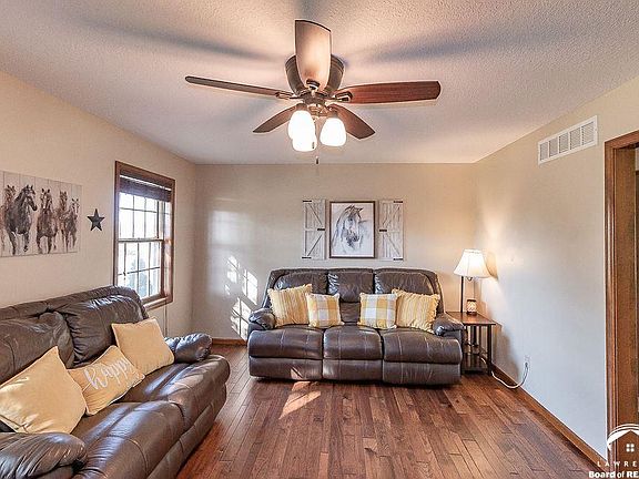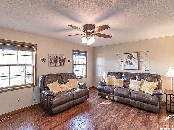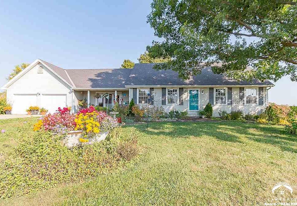 Enjoy rural tranquility and casual lifestyle in this renovated home that is just minutes to Lawrence and I-70 access.A home that blends modern touches with a country feel that offers glazed porcelain tile, solid hardwoods floors, spacious updated kitchen, with glass backsplash and updated fixtures and bath areas.Main floor master suite. Also offering main floor laundry and large office space. Outside property includes 9.76 acres of pasture, woods and small creek, abundant wildlife and awesome country views.