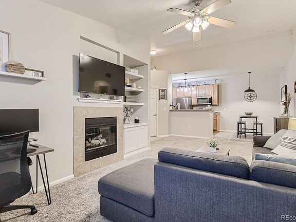 Top floor corner unit overlooking Cherry Creek OPEN SPACE, trails and close to everything! Prairie Walk on Cherry Creek offers a community clubhouse, fitness center, pool and jacuzzi just right across the street from this prime unit! The OPEN floor plan boast 2 balconies, one off the living room facing the park and open space and another off the master suite! VAULTED ceilings greet you upon entering this LIGHT & BRIGHT 2 bedroom, 2 full bath condo w/gas fireplace and CUSTOM built-in bookshelf. Enjoy all stainless steel appliances (all kitchen appliances included), GRANITE counter tops, eating bar area and dining room! The master bath is equipped with a linen closet and storage, tile flooring, granite vanity counter-tops, double sinks, very private exterior balcony off of master suite, full 2nd bathroom with tile flooring, granite vanity counter tops, laundry closet in unit (washer and dryer included). This property has a 1 car detached garage, (garages G1 garage space #C). The community clubhouse and pool are conveniently located to the unit as is the playground, walking/running/biking trails and open space. Lots of additional parking for guest and close to major interstates, E470, C470 and I-25, Denver Tech Center (DTC), Buckley Air Force Base, Denver International Airport (DIA), Park Meadows Mall, Cherry Creek Mall, Arapahoe Crossings Mall, Southlands Mall, Castle Rock Outlet Shoppes, Cherry Creek Reservoir, Golf Courses, numerous restaurants and shopping areas. This one won’t last!