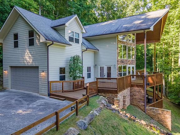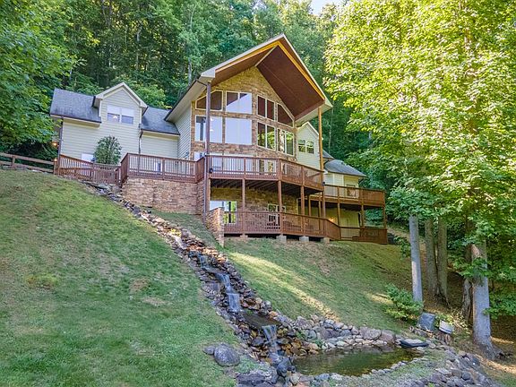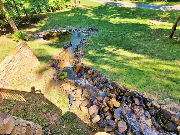 High-End Custom Home with living areas on 3 levels with mountain views & beautiful waterfall feature out front! This gorgeous home sits on a private 4 acre lot that has lush landscaping incl. a nice gazebo. Inside this 3 bed/3.5 bath home is an expansive living room with vaulted wood ceilings, wood floors, rock FP, & a wall of windows overlooking the mountains. The kitchen boasts granite countertops, a breakfast bar & stainless steel appliances inc. a brand new refrigerator. Main floor master bedroom with en-suite bath with jacuzzi tub & upstairs is 2 oversized bedrooms full bath & big loft. Downstairs is made for entertaining featuring a great room with a pool table, bar area, workout area & the most unique theater painted by artist Daniel Quigley that will make you think you are watching a movie under the stars! This one-of-a-kind home maximizes outdoor living with large upper & lower decks, making outdoor entertaining possible. There is a flat yard too that is great for gardening. This is located in a wonderful gated subdivision of high-end homes with paved roads not far from town yet you are far away from all traffic noise! Comes mostly furnished too! Internet is Frontier DSL.