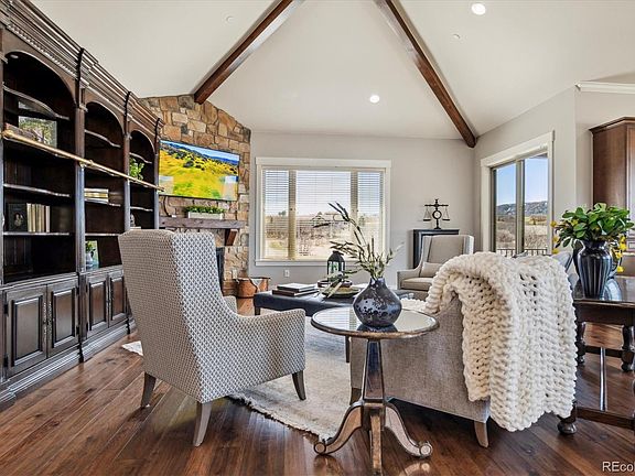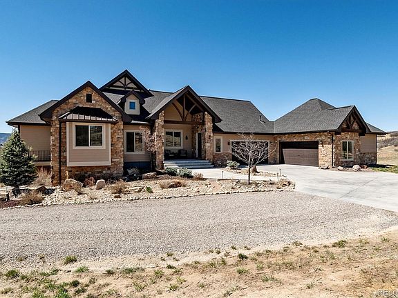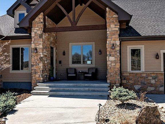 Wow! A Meticulously maintained custom walkout ranch offers serene privacy & stunning mountain views from its cul-de-sac location*5 minutes from the newly coming I-25 exchange w Costco & Trader Joes commercial area with new Keene Ranch access! Main level- a spacious primary suite w/vaulted ceilings & luxurious bath with no-threshold shower, dual shower heads, & pebble flooring*Surrounded by windows, the Great Room w/ its vaulted ceiling, wood beams & hardwood floors envelopes you within the panoramic views*A corner gas fireplace adds both ambiance & warmth*Dream Kitchen features solid wood cabinets, a 5-burner gas range, double ovens, expansive island with bar fridge, drawer microwave, & walk-in pantry*The dining room, with it's wall of built in's & wine storage, fully encompasses the lovely views*Step outside to an expansive covered deck set against the backdrop of breathtaking vistas*Laundry/mudroom is well-appointed w/ full-size sink, custom cabinets & granite countertops*Lower level w/ kitchenette, perfect for entertaining, room for billiard & TV area* 3 bedrooms w walk-in closets, 1 ensuite,(secondary primary suite) 2 w Jack n Jill bath *Oversized sliding doors open to the covered patio, extending the living space outdoors*Unfinished area provides storage, secondary washer/dryer hook-ups & fully encased concrete safe room*Above-the-garage bonus area serves as ideal space for home office/guests/older children/nanny, complete with dry bar, bathroom & separate entrance*Attached 4-car garage offers ample space for vehicles & storage.*An impressive 30x50 ft heated outbuilding includes RV/trailer bay w/ 30-Amp plug, generously sized workshop, electric & access to water*Behind the outbuilding find the private, year-round pond, ready to fish in summer or ice skate in winter* Property is fully mitigated for fire; full perimeter buried invisible pet fence; pre-plumbed gas line for fire pit*Paved roads, abundant wildlife, 16 miles of trails, Quiet-High Speed Fiber, & more