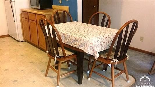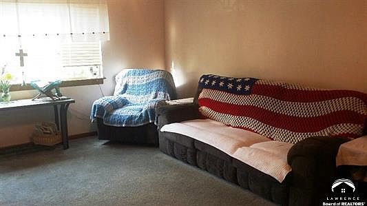 Great ranch home with a wide open floor plan. Extra large kitchen with loads of cabinets and counter space. Convenient laundry closet off of kitchen. Huge family room with lots of light and space. Two good size bedrooms. Back door leads to fenced in yard. Roof replaced in 2008. Great location to meet bus, get on K10 and close to downtown Lawrence and KU! Near parks, fair grounds and walking trails.