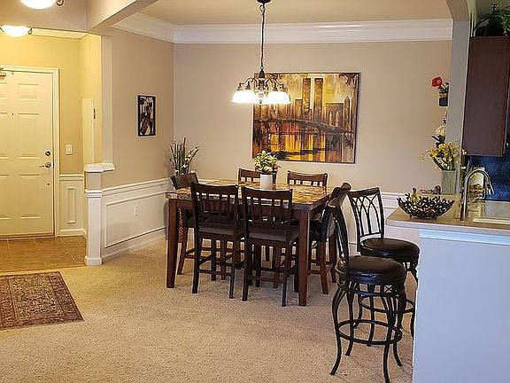 Pristine 2 bedroom, 2 bath open floor plan condominium with many upgrades including: stainless steel appliances, gas stove, Corian countertops, 9 ft. ceilings, crown and picture molding, tray ceiling and a featured design grid wall in master bedroom, stackable w/d, ceramic tile and upgraded carpet. Freshly painted in 2022, new hot water heater in 2018. Garage with interior access, 2 storage units on ground floor, and elevator access. Picturesque pond and fountain view. Resort style clubhouse with heated pool, pickleball, tennis, playground, gym, billiards, ping pong, bocce ball, resident garden and bbq area. Won't last!!