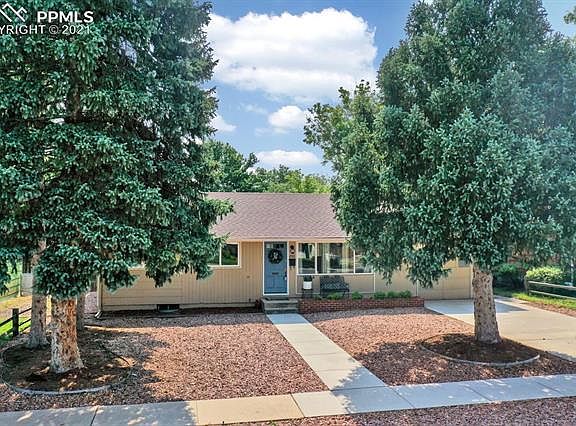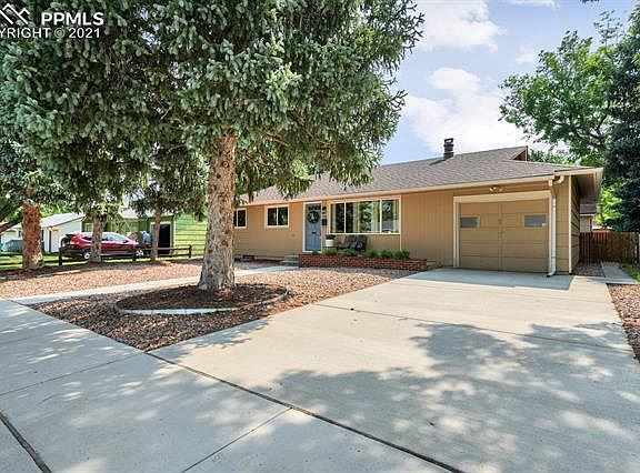 Great value in this light and cheerful rancher in a quiet, established neighborhood in central Colorado Springs. Xeriscaped front yard with large shade trees, a brick planter, new front walkway, driveway, curb, and gutter. Humidifier, newer central air, furnace, and water heater. 2017 roof. Hardwood floors thru the Living Room, Mud Room, Hallway, and 3 main level Bedrooms. The entry opens into the Living Room which offers a large picture window, wood-burning fireplace, and pass-thru to the Kitchen. The eat-in Kitchen features tile floors, and newly painted cabinets with laminate countertops and new low maintenance backsplash that requires no sealing or grout cleaning. Appliances include a smooth-top range oven, microwave, dishwasher, and side-by-side refrigerator. The Mudroom off the Kitchen has a planning desk with cabinets and access to the 1-car attached garage. The hallway to the Bedrooms includes a coat closet and built-in cabinets. The main level Master Bedroom boasts a lighted ceiling fan and mirrored wardrobe closet doors. There are two additional Bedrooms and a full bath with new vanity, medicine cabinet, and tub/shower. The finished Basement is a great place for entertaining with a large Rec Room complete with updated flooring, storage closet, built-in cabinets, and bar with refrigerator. Work from your home office with a walk-in closet (could be a non-conforming 4th BR). Full Basement Bathroom with tile floors, a vanity, and a tub/shower. The Laundry Room has more built-in storage cabinets and a washer/dryer that stays. Large fenced level lot with alley access, a 2-car detached garage, expanded concrete patio, and flagstone patio with pergola to enjoy the Colorado sunshine. Convenient location close to schools, Palmer Park, Rock Island and Santa Fe trails. Easy commute to Fort Carson. Minutes from the Powers Corridor and a 20 min bike ride to downtown Colorado Springs.