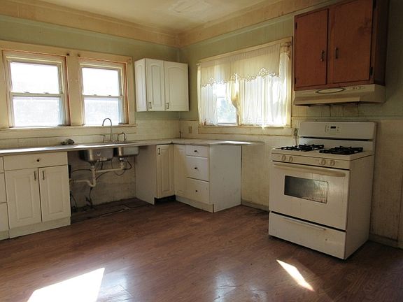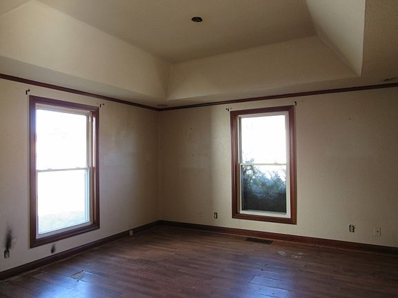 Home has some good features - tray ceilings in living and dining rooms, large covered front porch, main level bedroom. Plenty of potential here!