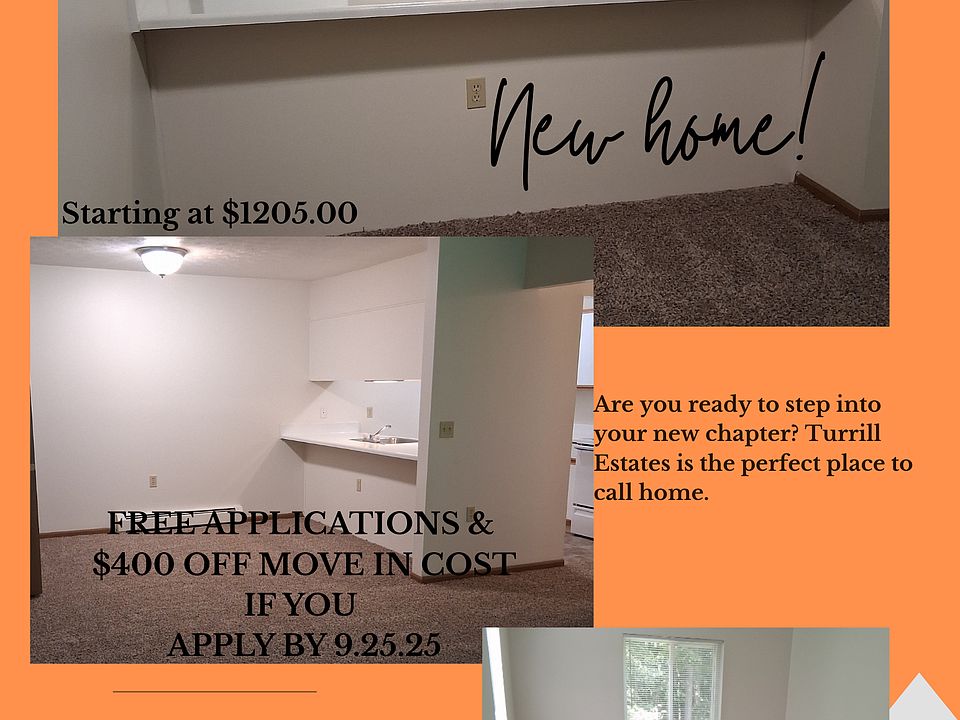 Welcome To Turrill Estates You will experience value and commitment to customer service satisfaction as it was meant to be! Our pattern of ownership, development and management enables us to provide you with consistent, reliable and dedicated service. You will find Turrill Estates is the best value with carefully thought-out floor plans that will exceed your expectations. Furry friends are welcome too! We invite you to come experience the carefree lifestyle that is Turrill Estates Apartments. Owner pays for trash removal, Renter is responsible for water, sewer, gas and electric. Maintenance onsite Monday - Friday 8am - 6pm Emergency line 24/7 12-month lease as well as short term options available.