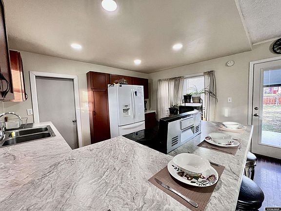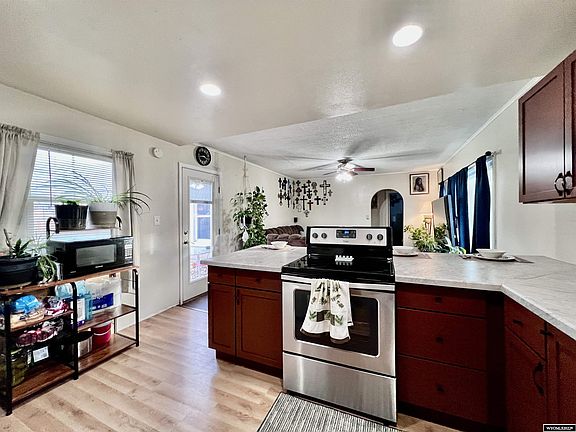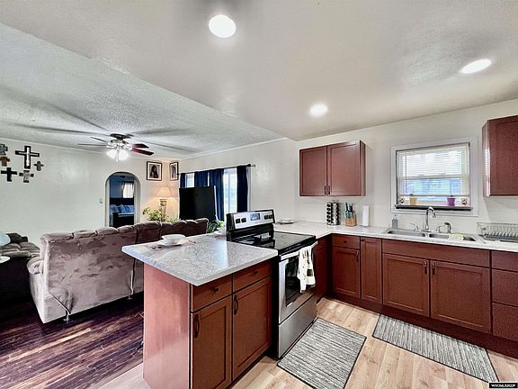 Located on a sprawling 9,414 sqft lot, in a peaceful street, and surrounded by low-maintenance landscaping, this property offers the best of both worlds: peace and quiet while still being close to conveniences and amenities. The updated kitchen features plenty of storage room in its beautiful cabinets and a bar with sparkling countertops ideal for cooking or eating. Adjacent to it, the living room is filled with light and air coming in from the door that leads outside and enhanced by the ceiling fan.