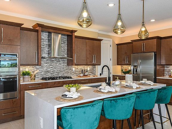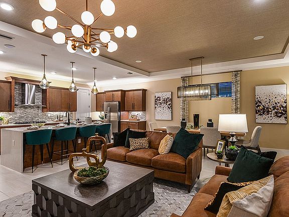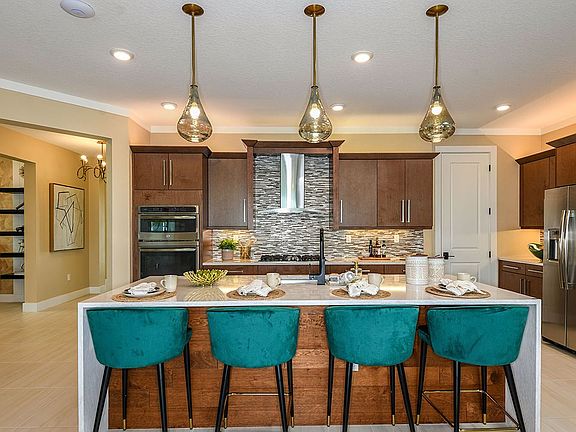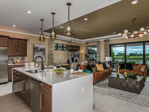 Main Living Space opens to the Kitchen which is complete with a large island, breakfast bar, quartz counertops, gas cooktop and wall oven. Den makes for a great home office or work space. Extended Garage offers additional storage space. * This Move-In Ready home in Cresswind Lakewood Ranch is located in Lakewood Ranch. Some home images may contain additional upgrades, finishes and/or features not included. Floorplan shown is base model and may not include structural options in this home.
