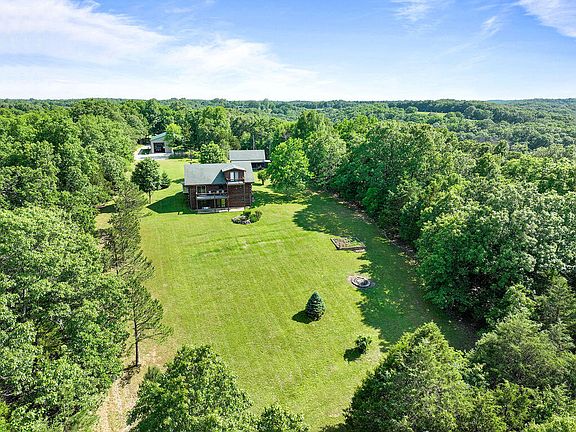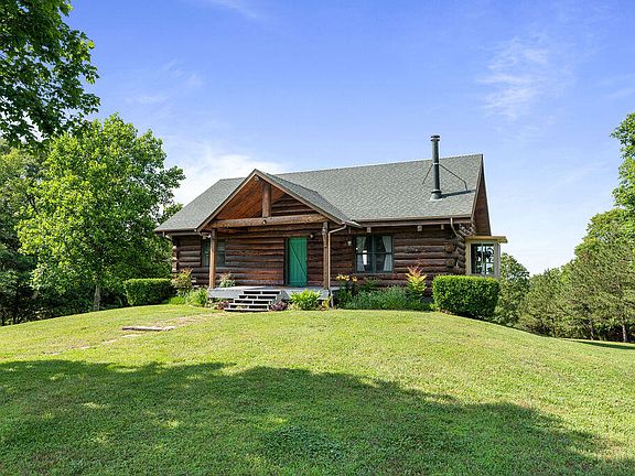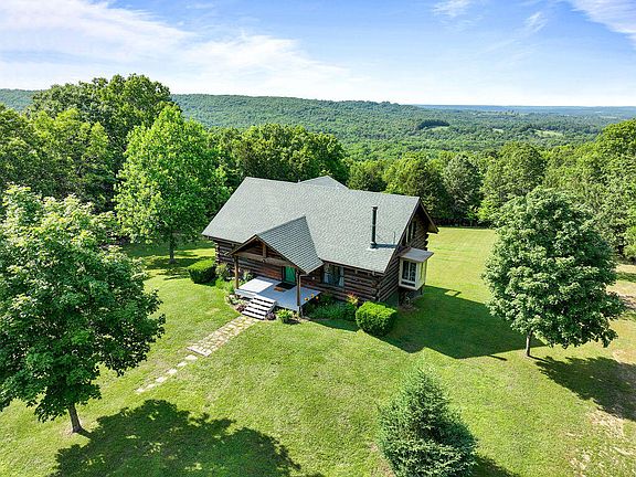 One of a kind picturesque log home with 80+ acres of amazing Ozark Mountain Views only 5 minutes from Shell Knob. Immaculate grounds with stone formations, trails, manicured lawn space with stacked landscaping beds filled with perennials that bloom various times across the summer. Apple, pear, peach trees and a pecan tree grove on the property add opportunities for homesteading, and/or self-sufficient lifestyle. Two large outbuildings have room for all your vehicles and toys, including a drive thru space for RV. The log home has multiple deck /porch spaces to soak in the views, a bump-out solarium area, and a large loft/bedroom area with separate deck, The basement is currently used as a 3rd bedroom area, den and an office and has a second full bath. Wood burning stove in great room greatly enhances heating costs. The utility costs for this home are amazingly low. This is the ultimate ATV, trail riding, exploring, nature-loving paradise. Wildlife galore! This property borders Mark Twain National Forest. Additionally, this home has fiber optic wifi that the owner's rave about and make it a perfect work-from-home environment.