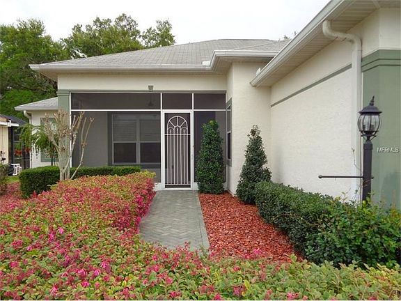 Located in the Exclusive 55+ Gated Golf Community of STONECREST adjacent to THE VILLAGES, FLORIDA! You are going to LOVE this custom SANIBEL Floor Plan with 3 bedrooms/ 2 baths. PRIVACY in backyard backing up to a private pasture with MAJESIC Oak Trees! There are MANY UPGRADES in this home you'll discover as you tour. Just to mention a few; whole house Water Softener System, Retractable self close Awnings in heavy winds, Storage units and overhead storage in Garage. SOLAR TUBES in Kitchen and Living room. HVAC replaced in 2012 with 13 Seer with April Aire filter and Humidistat! NEW ROOF 2020! Enclosed Lanai under air! Two Car PLUS Golf Cart Garage EXTENDED 4 feet! Brick paver drive and walkway. Sliding screen door over garage door and golf cart garage and keyless entry. From the Screened Front Porch you'll enjoy watching Golfers teeing off on the 14th Tee box and enjoy gorgeous sunsets in the evening! All furniture and fireplace in home optional! Schedule your showing today before you're too late!
