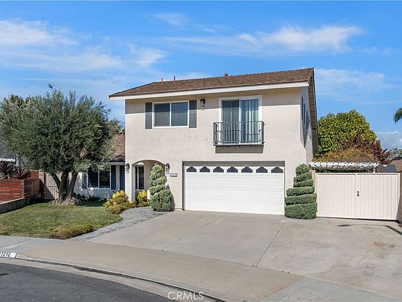Rare opportunity to live in this wonderful Cal Classic community in Huntington Beach. Located on a quiet cul-de-sac, this 5 bedroom 3 bath home offers 4 bedrooms and; 2 baths downstairs for desirable single- story living. The amazing upstairs suite includes living room, kitchenette, bedroom and; full bath making this the perfect in-law retreat, home theatre, gym, office, bonus room for the kids or an investment opportunity. First floor offers soaring vaulted ceiling in living room with recessed lights and charming fireplace; adjacent kitchen includes updated white cabinetry, granite countertops &; stainless appliances; spacious downstairs primary bedroom with private bath overlooks lush backyard. All of this plus an oversized private lot with wrap-around yard, professional landscape, raised planter gardens and a multitude of fruit trees including avocado, lemon, orange, pomelo and pomegranate. This special lot offers potential RV parking. Additional improvements include scraped ceilings, some new exterior paint and lighting fixtures. Located near shopping, schools & freeways and only minutes to the beach! This lot and location make this a very special home indeed!