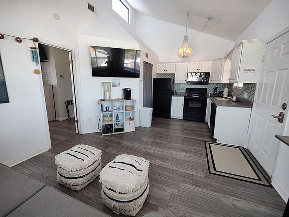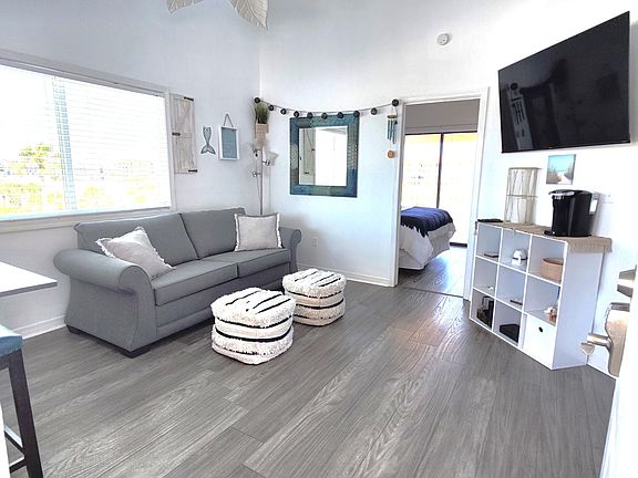 Remaining availability is for nightly or weekly rental only. NOT available for year-long lease. This light and bright, updated one-bedroom condo is located at Sand Castles West on Front Beach Road, a prime location directly across the street from one of the world's most beautiful beaches. Set on the quiet west end of Panama City Beach, approximately 328 feet from the sugar white sands, BEACH BEACH BEACH offers accommodations for four people with free wifi, a large outdoor balcony, BBQ facilities, two outdoor swimming pools and free parking for one vehicle. With pool and gulf views, this sweet spot is perched on the top floor, corner end-unit of a three-story building with carport parking and a gulf-view exterior entrance, which gets better as you reach the top! This amazing space boasts 18-foot vaulted ceilings and skylight windows, adding to it's bright, airy, open feel. Checkout the lovely window bar & bar stools where you can work or eat while enjoying the gulf water and sunset views. The kitchen is fully equipped with a dishwasher, microwave, stovetop/oven, refrigerator/freezer, washer/dryer, k-cup coffee machine, toaster... and everything you need to cook a meal, including cookware, dishware, silverware, utensils, bottle/can openers, & more, plus salt & pepper and some starter coffee pods for your first morning waking up at the beach! The unit is also equipped with a new 55" Smart TV w/cable in the living room, a Roku flat-screen TV in the bedroom, as well as a DVD player and multiple phone/tablet charging stations throughout the unit. There is a queen-size bed, as well as blackout curtains, in the bedroom and a queen-size sofa bed in the living room. The large ensuite bathroom includes a wardrobe & linen closet, shower/tub, extra comforters & pillows, iron & ironing board and a hairdryer. Four beach towels are also available for use, as well as a beach chair and a few beach/pool toys, to keep your packing to a minimum. Walk across the street to one of the world's most beautiful beaches with sugar white sands and turquoise blue-green waters. This top-floor, end-unit, vaulted-ceiling one-bedroom condo has views of the gulf from the living room & kitchen windows. Watch the amazing sunsets from your living room! Open the windows and balcony door for a beautiful coastal breeze! Wake up and enjoy coffee on your balcony overlooking the neighborhood scenery, edge-of-the-gulf view, and Pier Park ferris wheel, which is lit up in your skyline view at night! Watch Pier Park's weekend fireworks from your balcony. Stroll down the beach or street to the many restaurants, shops, bars, and live music options... Pier Park, the area's premier shopping, dining & entertainment center at the beach, is just a mile away! This condo has been freshly painted and updated with modern Boho touches to give you even more of that relaxing, worry-free beach vibe you deserve! It has also been thoughtfully appointed with extra little details to make your stay that much easier so you can spend your time enjoying the things you love... like the beach! Short-Term Rental Rates as follows: Sun-Wed $250/night Thu-Sat $275/night Weekly rate $1800/week (7 nights) Prices are higher during holidays. Please check specific dates. 2-night minimum stay $150 cleaning fee per stay $250 refundable security deposit Max occupancy 4 people. One car parking only. No pets allowed. No rental golf carts allowed on property. For more information and to book directly, please visit: OR contact the owner directly at: pcbeachme.com