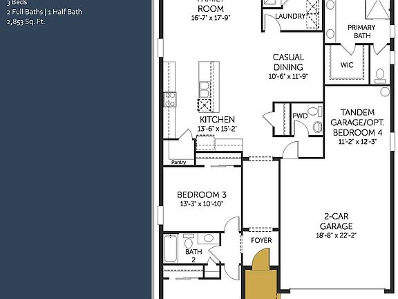 The Ravenna floorplan by Dream Finders Homes offers 2,853 square feet of thoughtfully designed single-story living. This spacious home features 3 bedrooms, 2.5 bathrooms, and a 2-car garage, combining comfort and functionality in a stylish layout. The open-concept design includes a large family room, dining area, and a gourmet kitchen with a center island and walk-in pantry-perfect for entertaining or everyday living. The primary suite serves as a private retreat with a luxurious bathroom and an expansive walk-in closet. Two additional bedrooms share a full bath, while a convenient half-bath is ideal for guests. A covered lanai extends the living space outdoors.