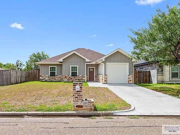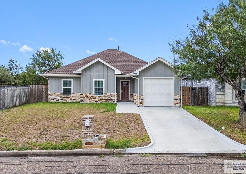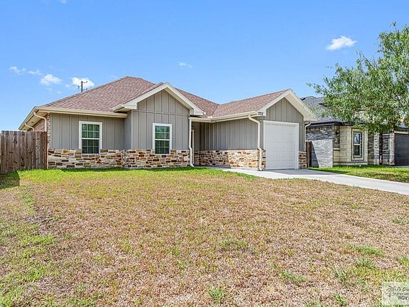 Welcome to this beautifully crafted 2023-built home featuring a stylish exterior blend of Stone, Board & Batten Siding, and Brick Veneer offering modern curb appeal and lasting quality. Inside, you'll find vaulted ceilings and neutral-colored walls that create a bright, open, and timeless aesthetic. The home boasts gorgeous tile flooring throughout, a beautifully tiled shower/tub combo in the guest bath, and a primary suite complete with a his-and-her vanity and a spacious walk-in closet. The open layout offers flow and function. Conveniently located in the heart of Harlingen, you'll enjoy quick access to schools, shopping, dining, and expressways.