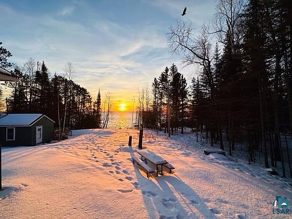 This Lake Superior waterfront property boasts a delightful cabin, accessible shoreline, bunkhouse, pole building and over 2 acres of land. Step inside the cabin, drop your coats and shoes in the large entry/mudroom. The bright and quaint kitchen has ample room for making meals or quick snacks. You will want to sit down for conversation, a movie, or games in the inviting living room. The good size bedroom provides views of Lake Superior at sunrise or watching the moon at night. The basement has room for storage, laundry and a sauna to warm up after a dip in Lake Superior. The bunkhouse has been updated with new windows, sliding doors, walls, flooring and large deck. This provides another welcoming space to visit, work, play or just enjoy the sites and sounds of the water. A wood burning stove takes the chill off on those cool days. Across the road is a 32x32 pole building for vehicles and toys. New septic, new Marvin windows, exterior and interior paint, flooring, and a new rock wall.