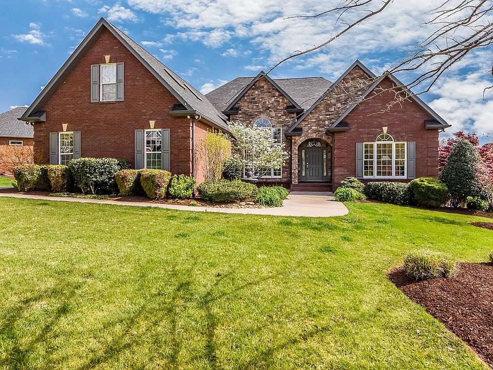 Wonderful brick rancher with walk out basement, open floor plan with formal dining area, kitchen with granite, see thru fireplace can be enjoyed in sunroom and living room, main level owners suite, split bedroom plan. The home is located on a neighborhood pond with pretty views of the mountains!