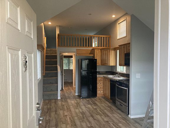 Park Model Home. One bedroom with loft, one bathroom, kitchen with gas range, microwave, garbage disposal, dishwasher, refrigerator, solid surface counter tops, tile backsplash, washer and dryer. Covered outside deck/patio. Plank flooring on main level and carpeted loft. Electric, gas, water, sewer, trash and internet included. Non smoking. Available September 10. Month to month lease, all typical utilities included, approved pets require separate agreement, deposit and additional rent of $50/pet/month. Non smoking property and quiet occupancy.