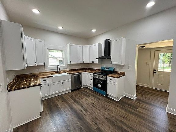 Features include: New kitchen cabinets with butcher block countertops, stainless steel appliances; new Luxury Vinyl Plank flooring throughout home; new bathrooms with double vanity sink in primary ensuite and custom tiled shower; tub/shower combo in secondary ensuite bathroom; all new electrical and plumbing, new energy efficient windows; metal roof; vinyl siding; laundry room with Washer/Dryer hookups; new water heater; new electric Central Heat/Air with new ductwork; new deck in large fully fenced in backyard.