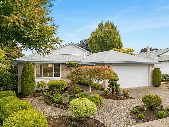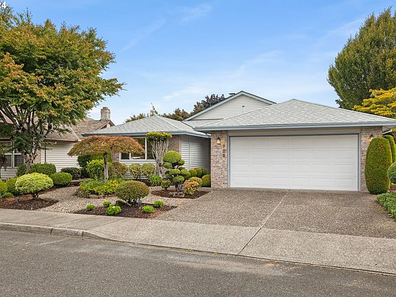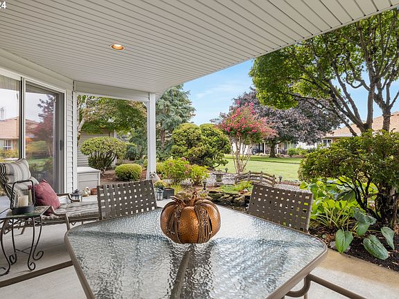 This stunning one-level, 3 bedroom Bayview floor plan is perfectly situated on the green space, offering serene views and a tranquil lifestyle. The meticulously crafted landscaping features a peaceful backyard water feature. Step inside to discover a beautiful hardwood floor entry that leads you into a bright and airy living space. The floor-to-ceiling windows fill the room with natural light, creating an inviting atmosphere. The vaulted ceiling and gas fireplace add to the charm, while custom built-ins provide both style and functionality. The dining area includes a slider that opens up to a large covered patio, perfect for outdoor entertaining while taking in the view. The kitchen features hardwood floors, gas appliances, granite tile countertops, instant hot water, and an eating bar. A cozy nook just off the kitchen offers additional space for a breakfast table, complemented by useful built-ins for added convenience. Retreat to the primary suite, where you’ll enjoy stunning views of the green space, a spacious walk-in closet, and a luxurious en-suite bathroom equipped with a walk-in shower, granite countertops, and double sinks. The home also includes an indoor laundry room with a sink and cabinets for added ease. With an updated roof and a level driveway for easy access, this home is not only beautiful but practical too. Enjoy the fantastic association amenities, including a pool, tennis courts, resident-only walking trails, spa, fitness center, library, and a variety of social events and activities. Schedule your tour today! [Home Energy Score = 5. HES Report at https://rpt.greenbuildingregistry.com/hes/OR10233258]