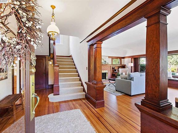 Located in Alamedaâs fine Bronze Coast and just one block from the famed Gold Coast, this grand Craftsman home possesses excellent curb appeal with very spacious, elegant rooms consisting of approximately 2322 sq. ft. 3 large bedrooms, 1.5 baths with a beautiful foyer with period detail leading you to the inviting living room with coved ceilings, original wood, classic window seat, and fireplace with symmetrical built in cabinetry. An impressive glass paned pocket door leads to the formal dining room with wainscoting and plate rail. The foyer, living and dining rooms all have refinished inlay hardwood flooring. The cheerful kitchen has new vinyl flooring and is very functional as it stands but awaits your dream design and remodeling in the future! The wood bannister staircase leads you up to 3 bedrooms generous in size with full hall bath . An additional 2nd bath could possibly be added to the enormous front bedroom by tying in with the hall bath plumbing to create a master suite.