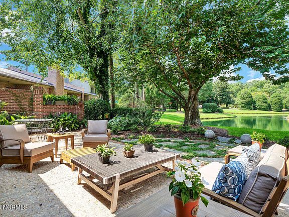 The finest Colony Club you'll find in Landfall. Redesigned by Kersting Architecture, this home has upgrades galore and a sizable patio overlooking a peaceful pond surrounded by lush landscaping. Gorgeous antique heart pine floors meet you in the foyer, and lead you throughout the main areas of the home. Your redesigned kitchen offers leathered granite countertops, Thermador appliances including natural gas range, custom cabinets with lined drawers & custom faces on refrigerator, compactor & dishwasher, and opening through the Dining Room to see the beautiful back patio area. Your reconfigured Primary Retreat includes a custom walk-in closet, walk-in tiled shower, and custom cabinets. Another 1st floor bedroom with full bathroom also opens to a charming courtyard. A sizable Great Room with natural gas fireplace & new surround, cozy Den & Office area complete the main level. Upstairs is an additional Guest Suite with built-in desk, full bath & good closet space, plus walk-in attic space. Other special features of this incredible home are solid core doors, redesigned foyer & added built-in desk, thick crown molding, HVAC & thermostats 2 years old, April Air cleaner June 2024, additional can lights & dimmers throughout, and generous storage closet outside. Conveniently located near Landfall's Eastwood & Drysdale gates this home has everything you need to live a carefree lifestyle.