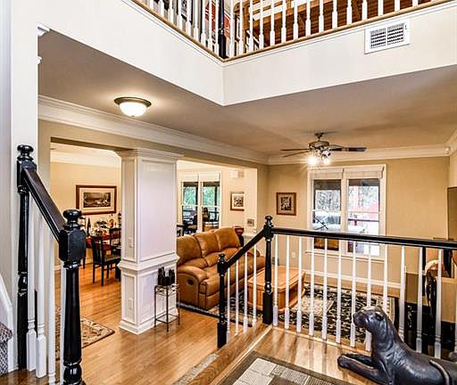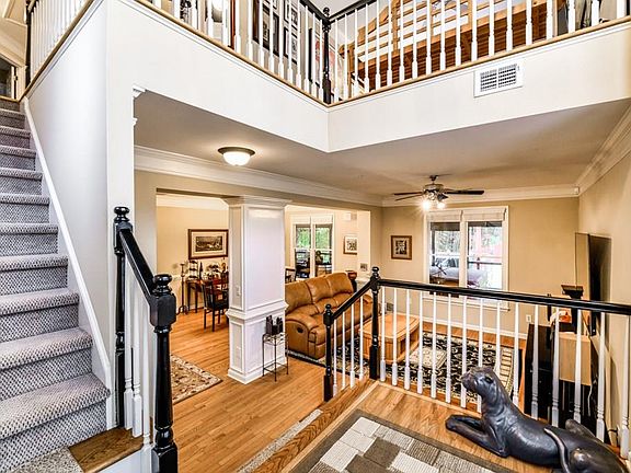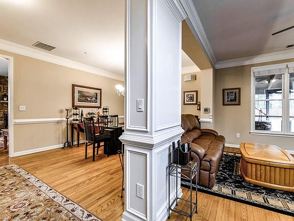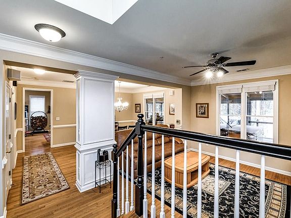 Contemporary home, leaded glass entry door, vaulted ceilings, remote custom blinds, hrdwds throughout main, Berber carpet upstairs. Family room w/dining area. Gourmet kitchen, stainless steel appliances, granite counters, customized cabinetry. Great rm w/stack stone fireplace with gas starter. Home zoned w/audio system, Dynamic surround sound. Upstairs entertainment landing. Master retreat w/jacuzzi tub, separate stall shower, dual sinks, walk in closet w custom cabinets. Screened porch w/tongue & grove natural wood ceiling, deck w/jetted spa & steps into second deck.