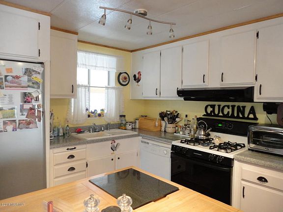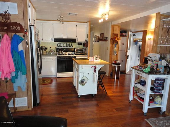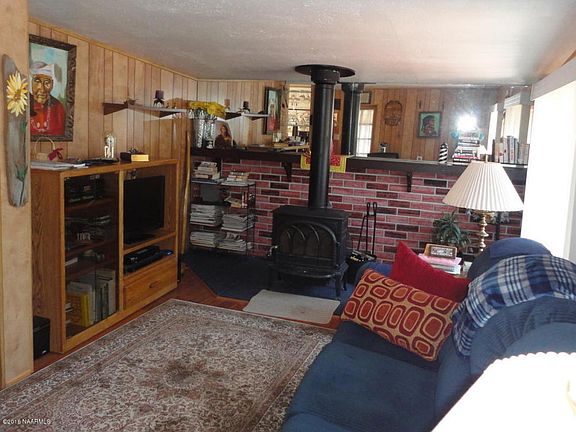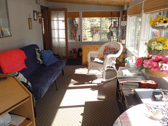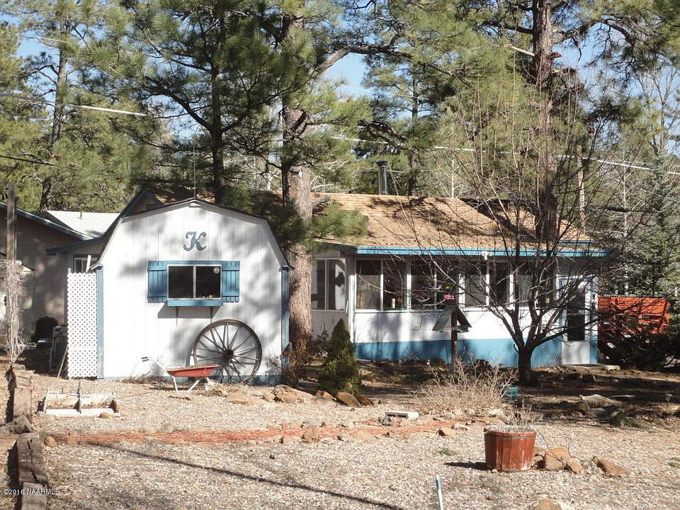 Adorable 2 BR 1.75 Bath; Wood Stove in LR sitting on attractive tile; Then wood laminate; Dual Pane Windows throughout; Kitchen has newer stove; newer counter tops, HANDY island on which to work and/or sit, Refrigerator; Enter the DR through the back door; Stack W/D and 40 Gallon Hot Water Heater and tons of windows and wood paneled ceiling in 12 X 30 Arizona Room; 12 X 26 open deck; Work Shop legally hooked up to elec.; small shed; FURNISHED AS VIEWED with exception of personal items; all on a WELL-TREED LARGE LOT! Park in back; Although owner shares driveway with neighbor on right please note this property has plenty of space in which to build it's own driveway in front yard and possibly a small garage. OMC with 25% Down + Credit Check.
