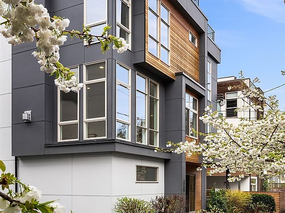 Welcome to a meticulously maintained, fully detached modern townhome in the heart of Ballard. This one-owner property boasts a spacious floor plan fulfilling all your needs. The first floor features a generous garage w EV charging & storage, along w a large guest room/office w en-suite bathroom. The modern kitchen on the main floor offers ample storage, stainless steel appliances, a half bathroom for guests, a deck, room for a large dining table, & a spacious living room. Upstairs, you'll find 2 expansive bedrooms, each large enough for a king-sized bed, w en-suite bathrooms. The rooftop deck covers the full footprint, providing stunning views of Mt. Rainier, the Space Needle & Olympics. WalkScore of 92 for convenience in a prime location.