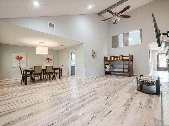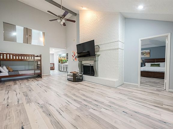 Double-sided fireplaceLots of natural lightHigh ceilingsBeautiful flooringLarge windowsFull barGorgeous chandelier