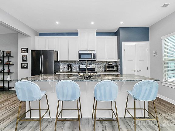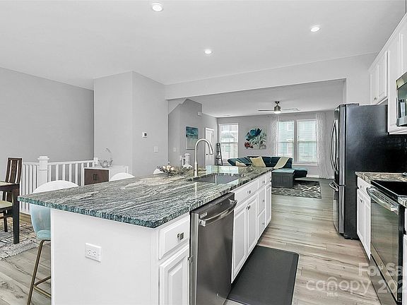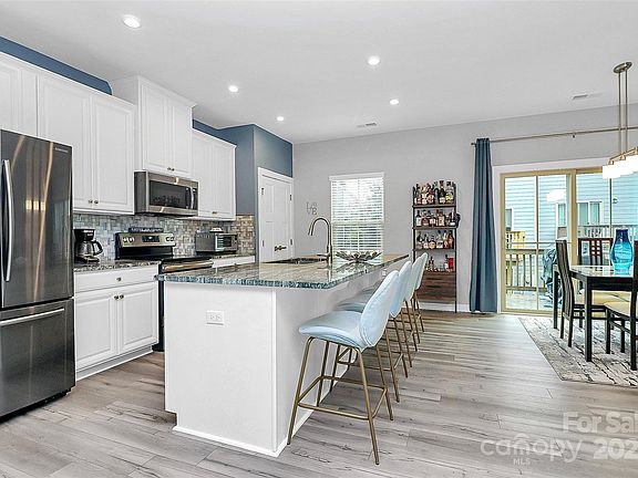 This is a light and airy must see end unit with a number of unique to the community upgrades including non-builder options of LVP on the first two floors and stairs, a large undermount sink w/water filtration system installed, granite, backsplash, custom mirrors in 2 bathrooms, lighting fixtures, ceiling fans with remotes, floor length drapery and professional neutral paint. Great open floor plan on the first and second floors, perfect for entertaining. Large deck and patio to enjoy the awesome Charlotte weather.
