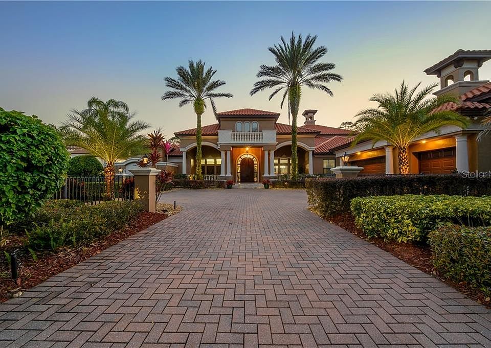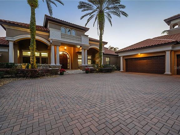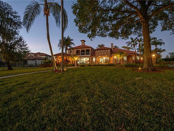 Welcome to this gorgeous 6,287 sqft mediterranean masterpiece. This fabulous estate sits on 3.48 acres of waterfront property overlooking the highly desirable ski lake known as Rainbow Lake. It's a 4 bedroom, 5.5 bathroom home with an office, movie theater, wine cellar/room with a wrought iron gate entry, bonus room with a wet bar, and plenty of other room to spread out in. The oversized 10ft arched front door, custom columns, and Italian travertine stone flooring transport you to a feeling of living lavishly somewhere in Europe. One of the best features of this home is the abundance of massive windows that overlook the views of Rainbow Lake. When you walk into the home you'll enter into the formal living room which has a custom tray ceiling, a palatial propane fireplace, and of course a jaw dropping view of the heated, Pebble Tec, salt water pool, waterfall spa and lake. The dining room is quite spacious and can comfortably fit a table of 10. Enter through the arched hallway to the kitchen/family room. Now a lot of features will beg for your attention, but some things that will be impossible to miss are the custom coffered ceilings, gourmet eat-in kitchen with granite countertops, high end custom wood cabinetry, Thermador appliances with cabinet paneling (TWO refrigerators), and a secret walk in pantry through the cabinets! Overlook the fantastic views from both the kitchen and the family room through some of the best windows in the home. Fantastic split floor plan with the master suite and office on the east side of the home, two bedrooms and the wine room on the west side of the home, and the fourth bedroom and stairs to the second floor at the back of the home. In the Master suite there is a sitting area with tons of natural light, a spa-like bathroom with a clawfoot tub, large walk-in shower with a rain shower head and multiple shower faucets, large dual sink vanity with a makeup station, and a large custom walk-in closet. Upstairs is the multi-level movie theater, wet bar, bonus room/loft with a full bathroom, and an unbelievable balcony with (more) jaw dropping views. This smart home can be controlled from your phone: security system, pool, outdoor propane fire pit, TVs, indoor/outdoor audio, etc. (tutorial included if needed!). Step out towards the water, past your built in cabana kitchen, and through the extensive mature and well manicured landscaping to your very own private covered dock with running water, electric and an open deck area to enjoy waterfront living at its best on Rainbow Lake. As an added bonus the home also has a concrete poured "safe room" built to FEMA standards. Some of the many other fantastic features worth mentioning are: 7in custom baseboards, crown molding, a 6 burner gas range with pot filler and custom copper hood in the kitchen, all new pool equipment a few years ago, and a gorgeous barrel tile roof! Additionally it's important to note that 3/4 of the bedrooms have bathroom en-suites and every bedroom has a walk-in closet! Ready to see it? Call and schedule your appointment today or request our virtual walkthrough tour where you can click your way through the home.
