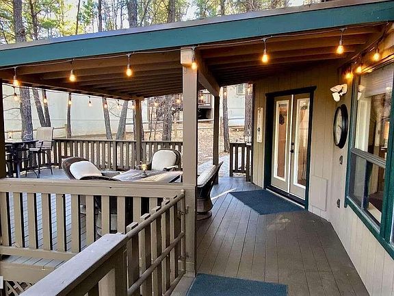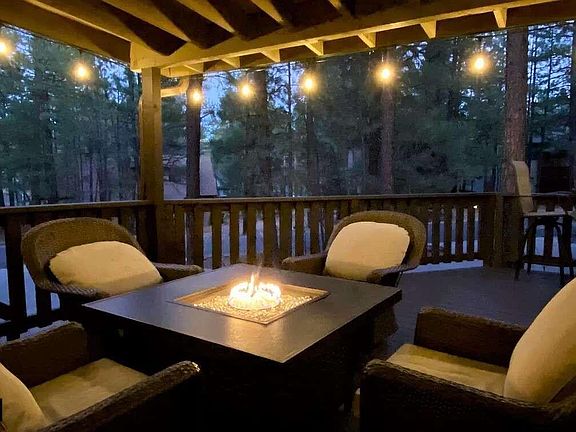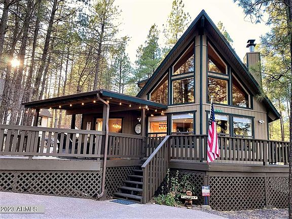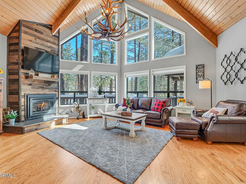 Gorgeous REMODELED MUNDS PARK Mountain Retreat, situated on a huge heavily treed lot w/paved circular driveway and a straight driveway leading to the back 1 car garage. NO HOA! Experience the pine trees & cool mountain air on the wrap around deck, covered patio or the back paver patio & fire-pit entertaining area. The spacious Great Room w/ FLOOR TO CEILING windows, vaulted ceilings w/tongue & groove, original HARDWOOD floors, gas stone fireplace, NEST thermostat & complete with A/C. REMODELED KITCHEN w/custom upgraded cabinetry, breakfast bar, leathered granite countertops & stainless steel appliances. Primary suite on main level w/a beautiful upgraded on-suite bath. A Spacious Bedroom 2 w/tongue & groove vaulted ceilings, private deck, enclosed window blinds, walk in closet & spacious on-suite upgraded bathroom w/leathered granite countertops. This home encompasses the ultimate luxury mountain retreat in the adorable Munds Park community close proximity to the golf course, restaurants, hiking trails & close to Odell Lake. Furniture included only with a strong solid/offer(except kitchen table and personal items per owner discretion).