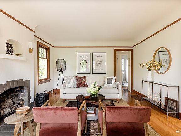 Nestled in the heart of Madrona, this stylish home offers sophisticated interiors with an ideal circular floor plan and lush outdoor spaces for easy living. Original architectural details include coved ceilings, wood windows with leaded glass, and a lovely fireplace. The elegant, renovated kitchen includes a marble-tiled backsplash and modern appliances. French doors in the kitchen open to a dreamy backyard framed by a picturesque willow tree, and featuring a spacious deck, gorgeous gardens, and vegetable beds. This four-bedroom home offers one on the main, which could also work well as an office. The finished lower level has a bedroom, three-quarter bath, family room and attached garage. A short walk to Madrona vibrant cafes, shops & park!