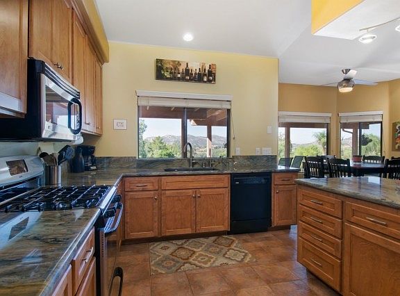 Updated custom home. private road. Huge master w/fireplace & spa-like bath w/deep-soak tub. Walk-in closets. Open kitchen w/granite countertops & ss appliances. family rooms open to large covered patio - expands entire length of home. Built-in BBQ & refrigerator station. Sunset & mountain views. Gated pool & large palapa seating area. Parking for lrg RV & boat. 3 car garage w/epoxy flooring. Closed in carport for extra storage. trees- lemon, lime, nectarine, avocado, pink lady apple. see supplemental)