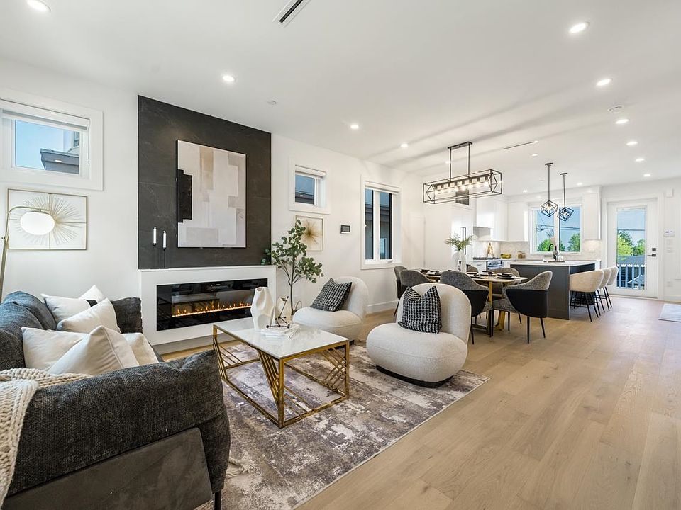 FRASERVIEW Side by Side duplexes on a prized 49x122 LOT SIZE. These homes embody exceptional craftsmanship & sophistication. Features 3 bdrms on the upper floor with additional bedroom for owners use in the basement & 1 bdrm WALK OUT legal suite. Inside, you'll find white oak hardwood floors, high ceilings, and an open-concept design that creates an airy, inviting atmosphere. Bright white shaker style cabinetry with integrated Fisher Paykel appliances including a 36 INCH GAS RANGE, WINE COOLER & EXTRA LARGE PANTRY. Other features include TANKLESS HOT WATER on demand GAS BOILER, Radiant heating, AC/Heat Pump systems for year-round comfort & No Sump Pump. Sunny South facing backyard. Sir James Douglas (French Immersion) & David Thompson Secondary.