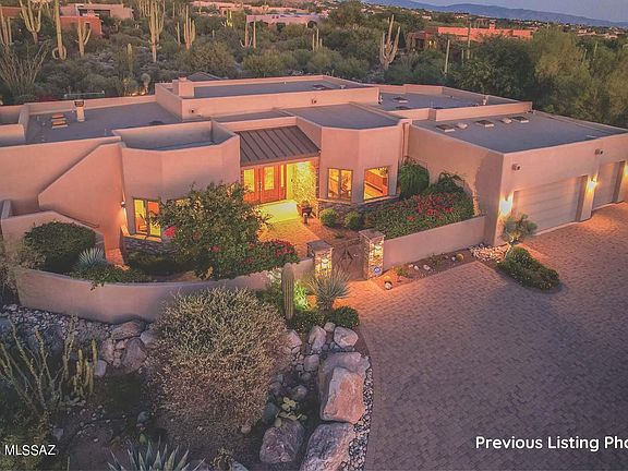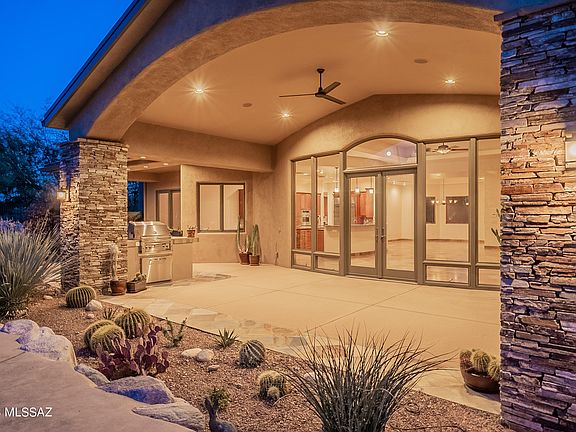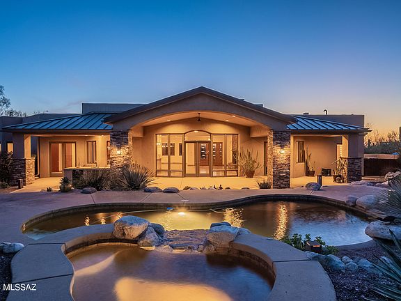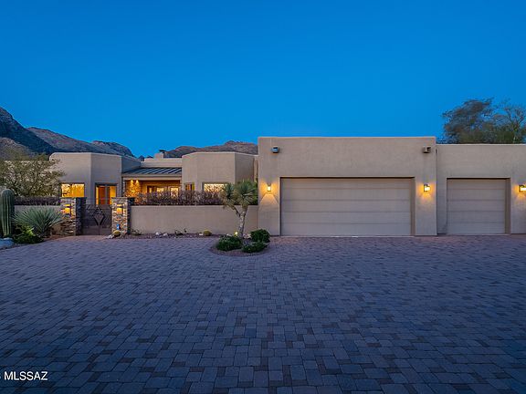 Exquisite Southwest contemporary located in the desirable Pima Canyon Estates on a private 1.23 acre lot; behind the second gate. Panoramic views of the Catalina Mountains, rare observations deck with views of the gorgeous twinkling city lights. Courtyard features attractive desert plants, a water feature, and stacked slate accents. Impressive Great room boasts vaulted ceilings, a stacked slate fireplace with ample natural light. Spacious well-appointed kitchen features, cherry cabinetry, stainless steel appliances, generous island, granite counters, nook and a breakfast bar open to the expansive Great room. Primary suite features a cozy gas fireplace, entrance to the backyard, and a generous bathroom with a round tiled separate shower, jetted tub and a large walk-in closet. Interior features include stone flooring, wood clad windows, and an ideal split floorplan; secondary bedrooms have their own private bathrooms and walk-in closets. Entertaining or relaxing will be a delight in the backyard under an expansive vaulted covered patio overlooking the refreshing pool and spa and Catalina Mountain Views! Built-in, barbecue with seating and prep space for to enjoying year-round outside dining.