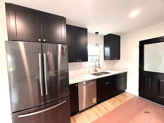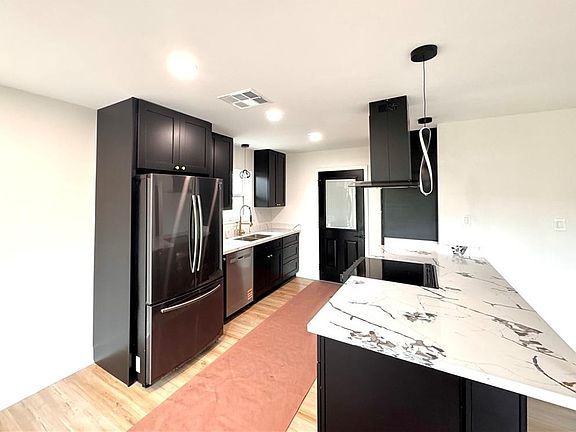 This beautifully renovated home offers modern style, functionality, and comfort throughout. Step inside to discover a bright open-concept layout with no carpet anywhere – easy-to-maintain flooring flows seamlessly from room to room. The brand-new kitchen is a true showpiece featuring dark stainless steel appliances, sleek dark cabinetry and trim, elegant quartz-style countertops, and a dramatic range hood. A walk-in pantry provides plenty of storage, making this kitchen as practical as it is stylish. Both bathrooms have been fully updated with designer tile, modern vanities, and gold fixtures for a fresh, high-end look.