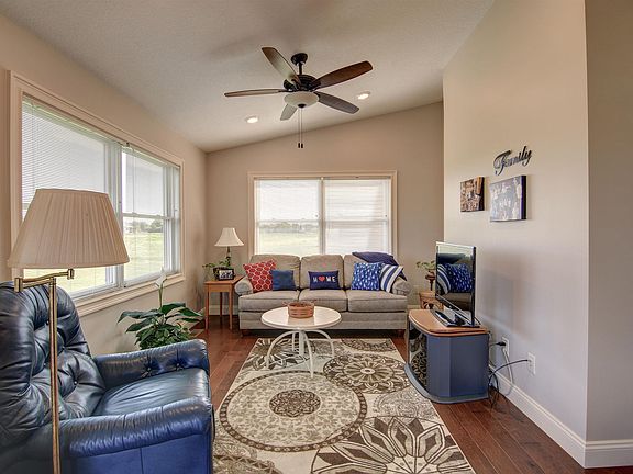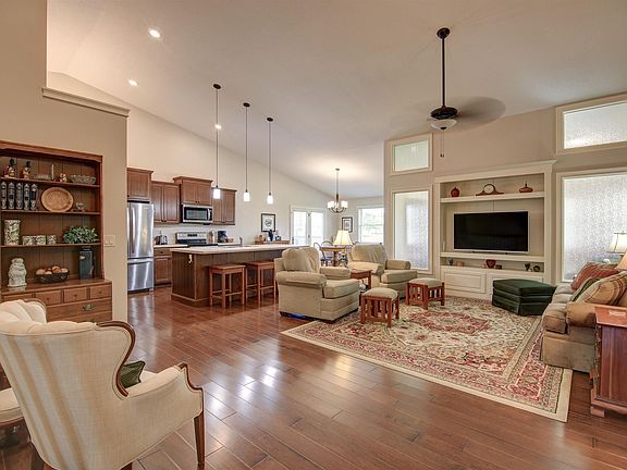 Immaculate smartly laid out ranch home on quiet Mill Creek Crossing. Wood floors throughout living area. Living room with built-ins that is open to the kitchen and eating area. Eating area has oversized windows with access to a 4 season room also with oversized windows. Walk-out to deck from the dining area with maintenance free decking. Access to the garage from the deck. The kitchen cupboards have lower pull out shelves and cupboards are soft close. Separate coffee bar/serving area. Whirlpool appliances/Bosch dishwasher included. Utility room between the kitchen with and abundance of built in shelving. Large primary bedroom and bath with double sinks, walk-in shower and walk-in closet with access to the attic. Additional bedroom also with walk-in closet. 4 car garage-finished, insulated and heated. Full basement with plenty of windows for future use. Stub in for toilet and shower. Centrally located home with easy access to the by-pass. Pride of ownership is evident with this home.