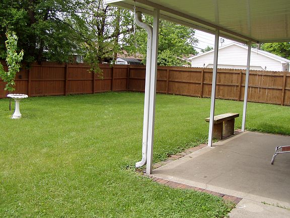 Brick ranch style home with a 2 1/2 car attached garage, huge backyard with wood privacy fence and large covered patio located in a lovely neighborhood with wonderful curb appeal. New roof installed in 2012. Floor plan offers a spacious living room with closet, dining room with sliding door to patio and a kitchen with range, dishwasher and refrigerator. There are 3 bedrooms including a master with a full bath. There is also a full bath off of the main hall. Features include: awnings over the windows, front storm door, replacement windows and landscaping including mature trees. Garage has a workbench, built in storage cabinets, pull down attic stairs, door to backyard and a laundry area with washer and dryer hook-up.