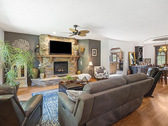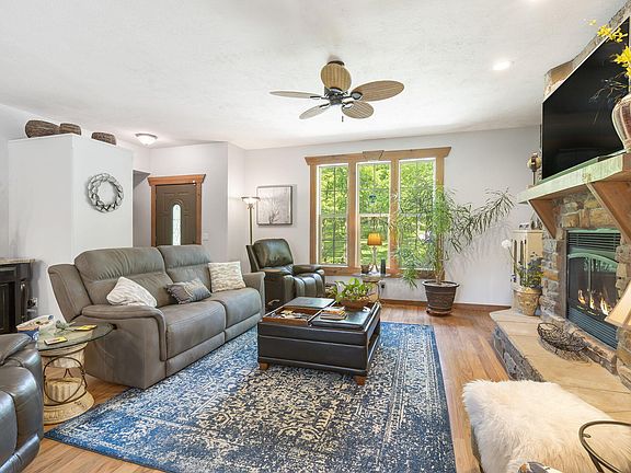 Welcome to a marvelous custom home offers an open floor plan with an abundance of amenities that will delight even the pickiest buyer. This home offers 3 bedrooms, 2 bath (2 primary suites) on 2.82 acres with a private driveway full of mature trees completely surrounding the property, It begins with 6 inch exterior walls, a big screened porch, large deck and a patio with fire pit. Inside there are high ceilings, a floor to ceiling gas log stone fireplace, decorative ledges, gorgeous laminate and tile flooring, central vac and jetted tub. Youll love the gorgeous kitchen that offers granite countertops, skylights, alder cabinets and a raised dishwasher. The master bath has a curtainless walk in shower and sky lights. These are only a few of the fantastic features. There is a detached 3rd car garage that has been converted to a wonderful heated and cooled office which boasts 360 sq ft.