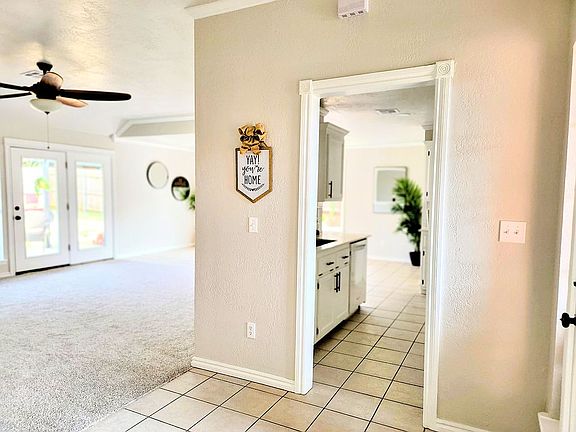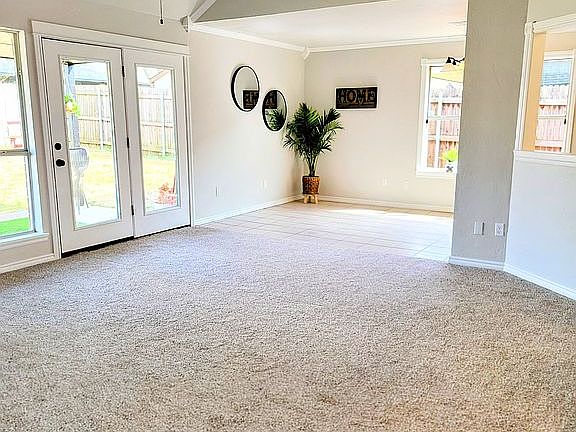 Entertaining is a breeze in the spacious living room, adorned with plush new carpeting and a gas fireplace surrounded by white marble, perfect for cozying up during chilly Oklahoma evenings. Large windows and French doors flood the space with natural light, leading out to a comfortable covered patio overlooking the expansive backyard, ideal for gardening enthusiasts or hosting a BBQ with your friends and family.