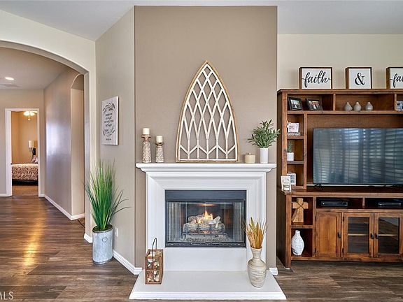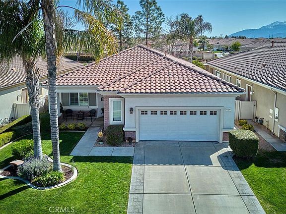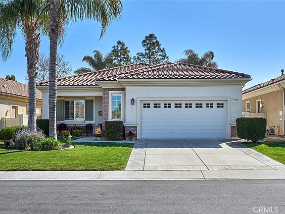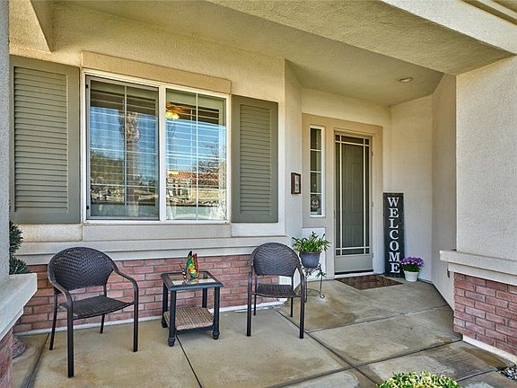 Experience refined living in the sought-after Trillion model, nestled within the prestigious 55+ gated community of Solera. This well-maintained residence features elegant plantation shutters throughout, high-end luxury vinyl plank flooring, and comes complete with newer appliances and a water softener. Step inside to a bright, spacious living room accented by a warm, inviting gas fireplace. The kitchen is beautifully appointed with Corian countertops and abundant storage, while a separate den or home office provides a versatile space for work or relaxation. The garage offers ample space and built-in cabinetry for organized storage. Outdoors, relax in a private, low-maintenance backyard framed by mature palm trees, with no rear neighbors and convenient extra street parking across from your driveway. Residents of Solera enjoy exclusive access to a vibrant clubhouse, sparkling pool and spa, state-of-the-art fitness center, indoor walking track, tennis courts, bocce ball, social clubs, classes, and group excursions. HOA benefits include free basic Spectrum cable and internet. Perfectly situated with quick access to the I-10, and just a short drive to Palm Springs, Redlands, Cabazon Outlets, Morongo Casino, and premier golf courses. Discover the lifestyle you deserve — Welcome home to Solera!