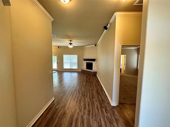 This beauty is Nestled in the heart of Edmond! All in one floor in the Gated Community at Kimberly Crossing that offers Community Park and Playground!! Home features: 3 bedroom and 2 full baths plus study that can be used as 4th bedroom or nursery or as your office with 3 car garage!. As soon as you walk in in you will be greeted with the Nice living with an open concept that makes family living room feel very cozy with fireplace! Kitchen features: all stainless-steel appliances, granite counter-tops and oversized pantry, plus plenty of counter space for extra storage! The primary suite is perfectly situated in the corner of the house for privacy and away from the secondary bedrooms, it features a walk-in closet, tall tray ceiling with the jetted tub and his and her vanity! The secondary bedrooms are on the other side of living and away from the primary suite! The backyard has been designed with a huge, covered patio making it the perfect for entertaining, plus extra added concrete for new hot tub with 220 vol. The entire backyard is fenced with sprinkler system! Your new home also has a storm shelter in the garage! New paint throughout the inside and outside! Extra decking for storage in the attic! Blinds throughout the house! Crown molding throughout except secondary bedrooms! Luxury laminate in living room! Close to Mitch Park! Close to all shops and restaurants!