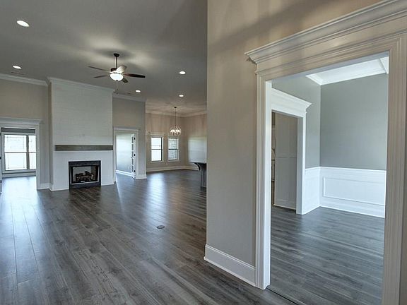 All brick Bellewood Plan A is an open plan with a 3 car side entry garage backed by a 2-10 home warranty.. Home has 4 bedrooms, 3 baths and a Sunroom. Home has wood plus flooring (Mohawk Revwood) in all living areas and bedrooms. Great Room features 12' ceiling, extensive trim, gas-log fireplace with upgraded fireplace treatment, wood plus flooring, floor outlet, recessed lights and ceiling fan. Dining room has 10' coffered ceiling, wood plus flooring, extensive trim including shadow box under chair rail. Open Kitchen has 12' ceilings in kitchen, custom cabinetry and granite countertops, large 45-degree island with bar seating, stainless appliances including dishwasher, gas cooktop, wall oven and wall microwave, tile backsplash, wood plus flooring, recessed lighting, and walk-in pantry. Breakfast has 12' ceiling, wood plus flooring and extensive trim. Master bedroom has 11' double tray ceiling, wood plus flooring, recessed lighting, extensive trim and ceiling fan. Master bath has 11' ceilings, glamour tub, large tile shower with rimless door, separate toilet area, double vanity with granite countertops and large walk-in closet. Sunroom has 12' ceiling, wood plus flooring, French doors to family and ceiling fan. The additional bedrooms have 9' ceilings, ceiling fans, crown molding and wood plus flooring. The additional baths have 9' ceilings, tile flooring and granite counter tops. Laundry has 9' ceiling, custom cabinet and tile flooring. Rear porch includes ceiling fan. Home
