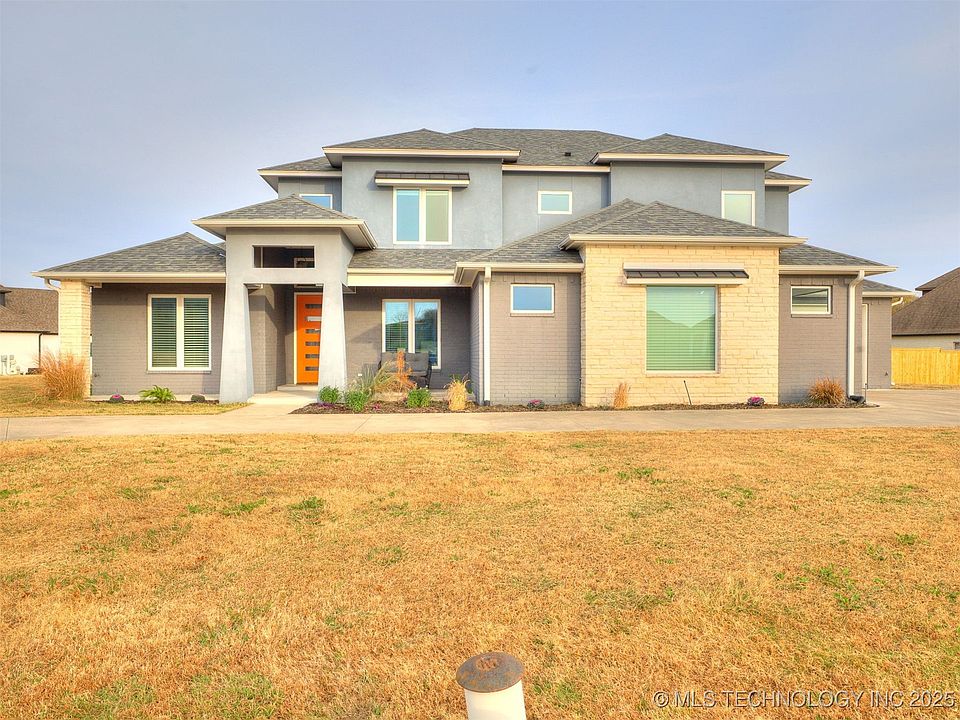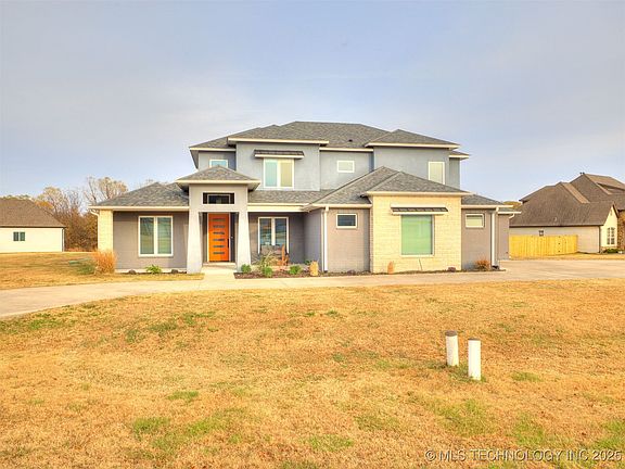 Set in a quiet Bixby School District neighborhood with a country style feel, this contemporary home offers a warm approach from arrival.Seller is excited to offer a delightful $10,000.00 in concessions with an acceptable offer! The circle drive provides convenient parking for daily use and entertaining. Inside, hand scraped white oak floors add character, and the Italian porcelain fireplace creates a clean focal point that complements the open layout and natural light. The kitchen features restaurant grade appliances, marble counters, and custom cabinetry for everyday cooking or hosting. Each of the four bedrooms has a private bath, and a guest half bath adds convenience. A safe room sits near the mudroom, and added features include a wet bar, roll in shower accessibility, tankless water heater, insulated windows, dual HVAC systems, and an oversized three car garage with a tandem drive thru bay suited for trailers or workspace. Outdoor living includes a covered patio and an upper balcony overlooking the 0.56 acre lot.