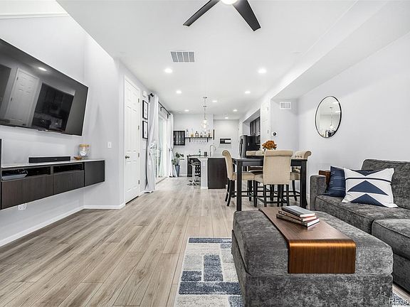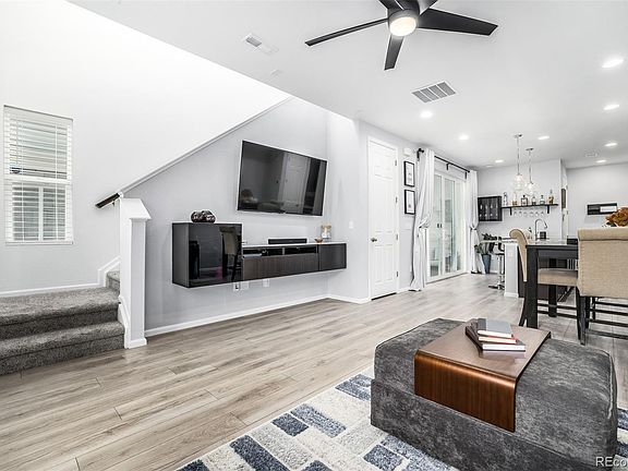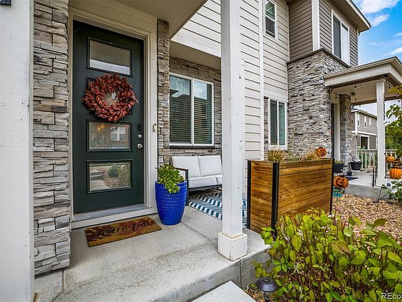 Abundant natural light beams throughout the inviting interior and is accented by tall ceilings, neutral paint, and modern recessed lighting. Easily entertain from the spacious open-concept main floor with a sliding glass door off the kitchen that connects seamlessly to the covered patio which is the perfect place to enjoy the Colorado weather all year long. The kitchen features granite countertops, designer backsplash, black stainless refrigerator and black appliances, and a functional island with built-in storage and bar seating- perfect for gatherings of all kinds! Large primary bedroom with en suite that includes a large shower, double vanity, and water closet all finished with luxury vinyl plank flooring and well-organized large walk-in closets. Take advantage of low electricity bills and green living with the included solar panels (the solar lease needs to be taken over by the new buyer). Enjoy your evening walks in the quiet neighborhood parks nearby, minutes away from shopping, dining, and DIA with quick access to I-225.