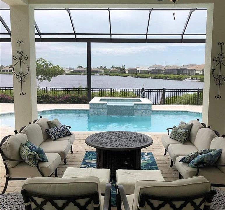 Gulf Access home in one of S. Fort Myers best kept secrets. This Useppa II Model located in Hidden Harbor Estates is a light and bright "Coastal Modern" home with an open concept floor plan over looking your own private boat dock on the harbor. Just a 30 min boat ride to Estero Bay/Lovers Key via Ten Mile Canal and Mullock Creek. The kitchen is loaded with upgrades such as GE Profile stainless steel appliances, Granite counter tops and a GE built in beverage center/wet bar. 12' ceilings compliment the great room, dining room and study. Master suite is enhanced by tray ceilings, wall to wall sliding doors offering a spectacular view of the harbor. The spa like master bath has a soaking tub, frame less shower enclosure and separate vanities. High impact glass windows and doors throughout entire home are dressed with custom floor to ceiling draperies. Soak in your custom Pool/Spa on the huge covered lanai and watch manatee play after a long day out on the water. Custom outdoor summer kitchen, spectacular southern exposure and incredible water views make this the perfect Florida retreat. Come see for yourself!!!