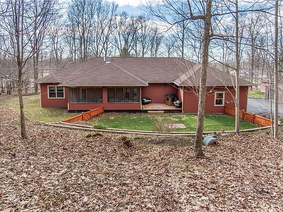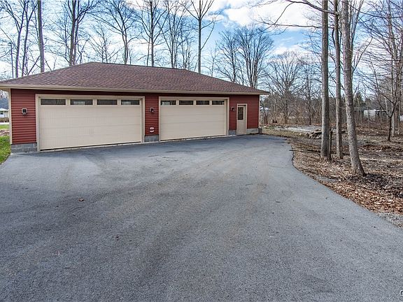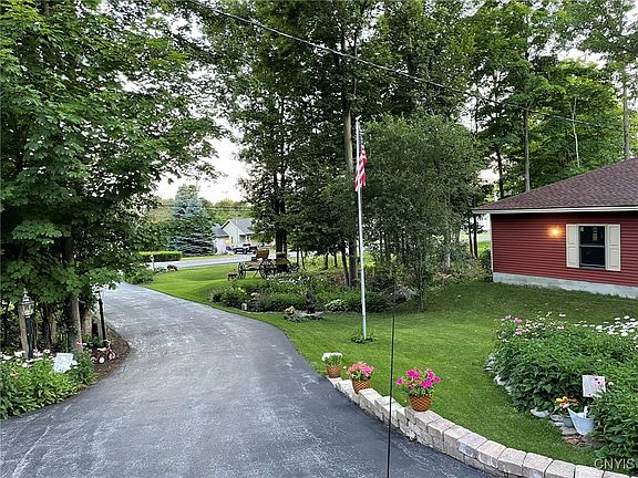 Welcome to this beautifully maintained 2013 ranch-style home nestled on 17 serene acres of woodsy landscape- offering the perfect blend of privacy and comfort. Walking into this home, you'll notice the 9' ceilings and the quality craftsmanship throughout. This 3-bedroom, 2-bath home features spacious bedrooms and a well-appointed primary suite complete with a luxurious ensuite bathroom, showcasing a massive walk-in shower with bench seating and private access to the screened-in porch. The open-concept kitchen is a chef's dream, with granite countertops, a large island, built-in double ovens, a walk-in pantry, and ample cabinetry. A built-in desk area adds convenience, while the eat-in dining space flows seamlessly into the expansive living room. You'll love the double-sided fireplace that warms both the kitchen and the living area - perfect for cozy nights. Rustic, birch flooring stretch throughout the home, adding warmth and elegance. From the kitchen, step out onto the spacious screened-in porch - ideal for relaxing or entertaining while enjoying the peaceful views. Additional features include a large, attached garage with a workshop area, a partially fenced-in yard, a retaining wall with a water feature, and a fully finished detached garage with space for 4 additional vehicles- just add heat to make it your dream workspace or bonus area. There's an additional shed that is currently a wood shop. Wait until you see the beautiful flower gardens throughout the property. The landscaping is top notch with strawberry plants galore! This property offers space, functionality, and a peaceful natural setting- truly a rare find! Close to local amenities and a short drive to Ft. Drum! South Jefferson school district.